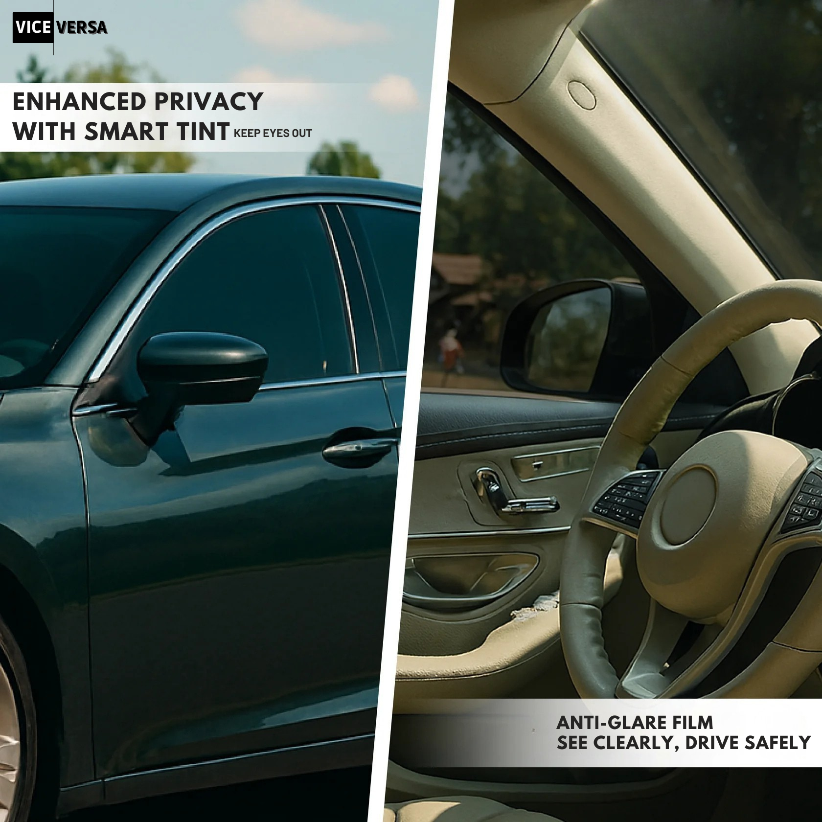 Vice Versa Tints give you full control over darkness levels from 5% for maximum privacy to 70% for clear visibility. Adjust your tint instantly to match weather, driving conditions, or local laws.