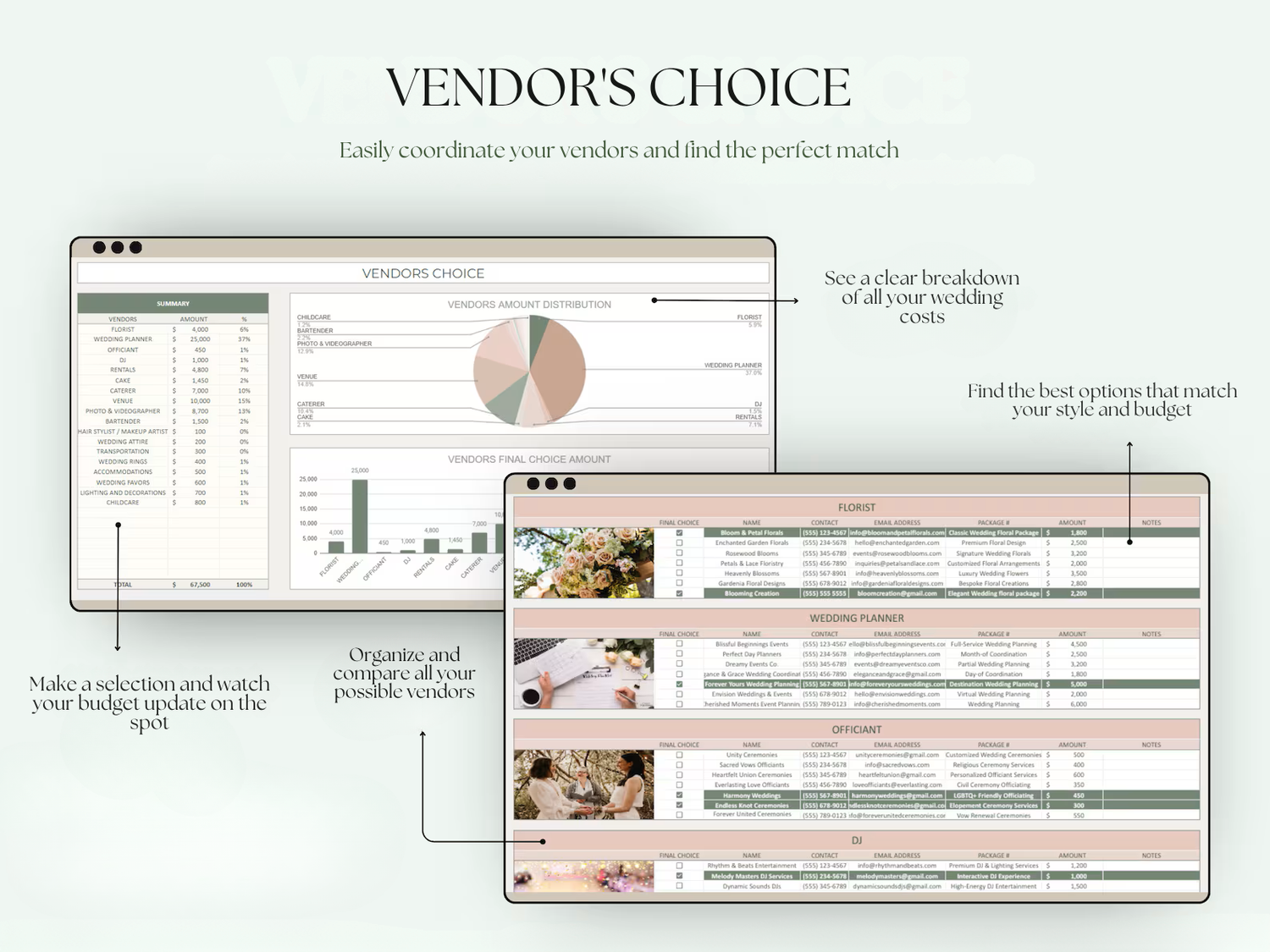 List all your vendor options, compare their prices, and pick your favorite — your budget updates automatically when you check the box.